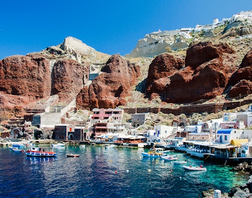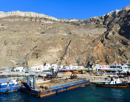 Accroché aux falaises de la caldeira, juste en dessous de Fira, ce port est principalement utilisé par les bateaux de croisière et les petites visites en bateau. Vous y descendrez en téléphérique, à dos d'âne ou par un escalier abrupt.