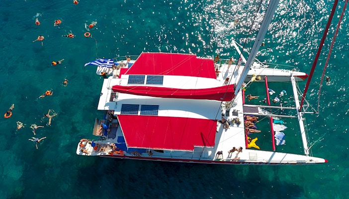 Croisière de luxe en catamaran à Santorin avec repas, boissons et transferts